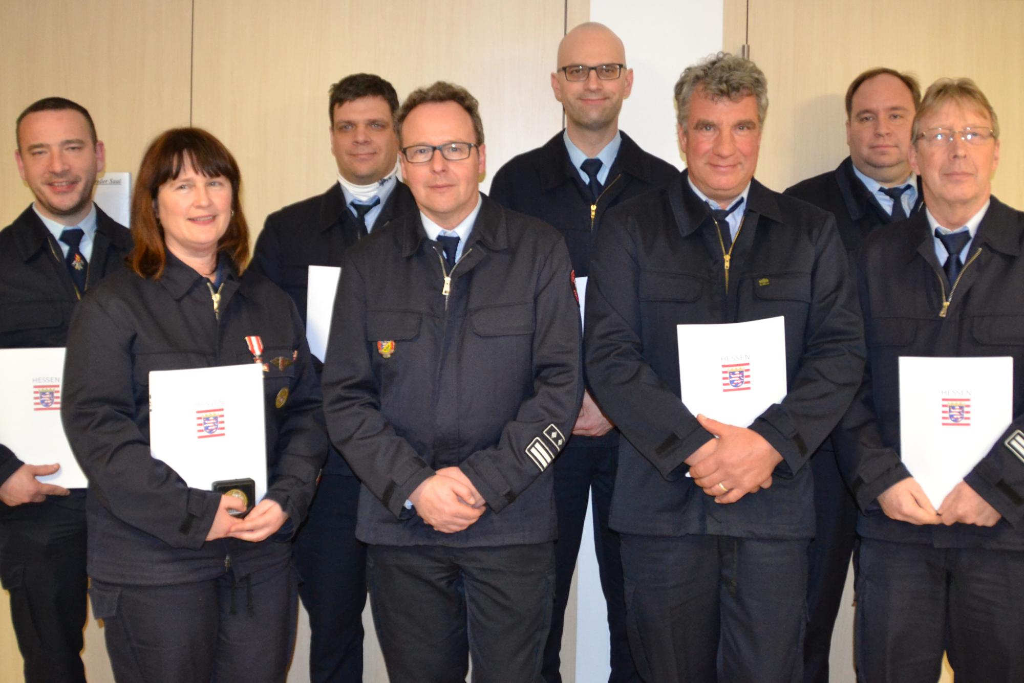 Die Anerkennungsprämie des Landes Hessen für langjährige Dienste in der Einsatzabteilung wurde den Kameraden Alexander Herrmann, Sascha Hinrichs und Marco Stephan für 20 Jahre, Jörg Alheit für 30 Jahre sowie Joachim Gries für 40 Jahre überreicht.