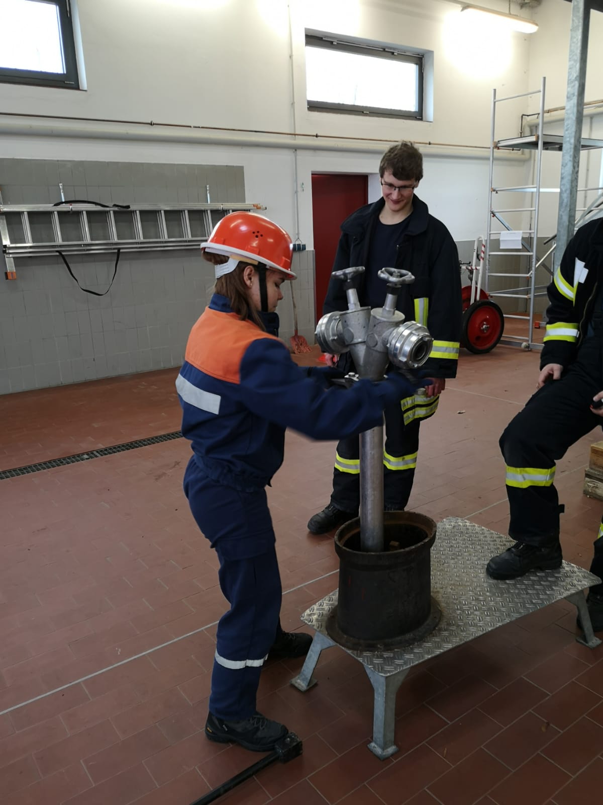 In der dritten Disziplin ging es um das Thema Knoten und Stiche, die an verschiedenen Gerätschaften fachgerecht angebracht werden mussten. Bei der vierten Disziplin sollten die Jugendlichen den Umgang mit Kleinlöschgeräten unter Beweis stellen.