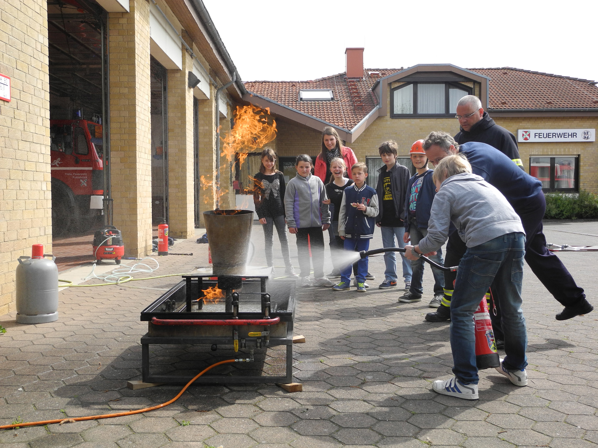 Eine weitere Station befasste sich mit dem Thema Brennen und Löschen. In kleinen Experimenten wurde demonstriert was brennt, welche Gefahren es gibt und welche Löschmöglichkeiten zur Verfügung stehen.